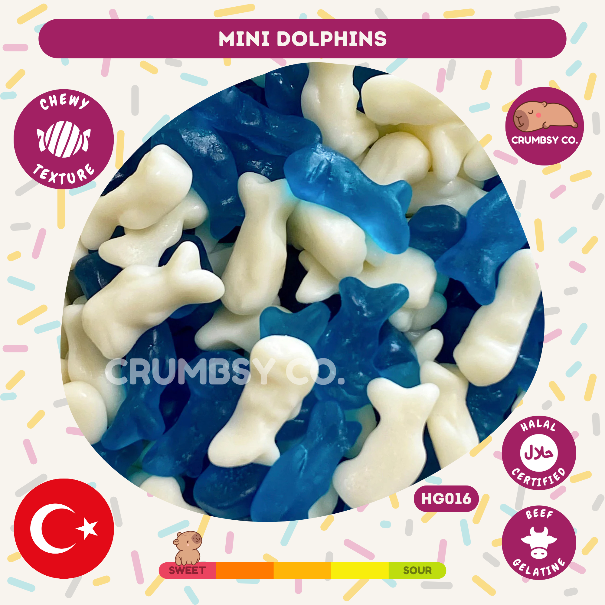Mini Dolphin are full of fruity flavour and bright colours, shaped like playful dolphins for a fun and tasty treat. Each gummy has a chewy texture and a sweet burst of flavour, making them a delightful choice for all ages. Made with beef gelatine and 100% Halal certified.