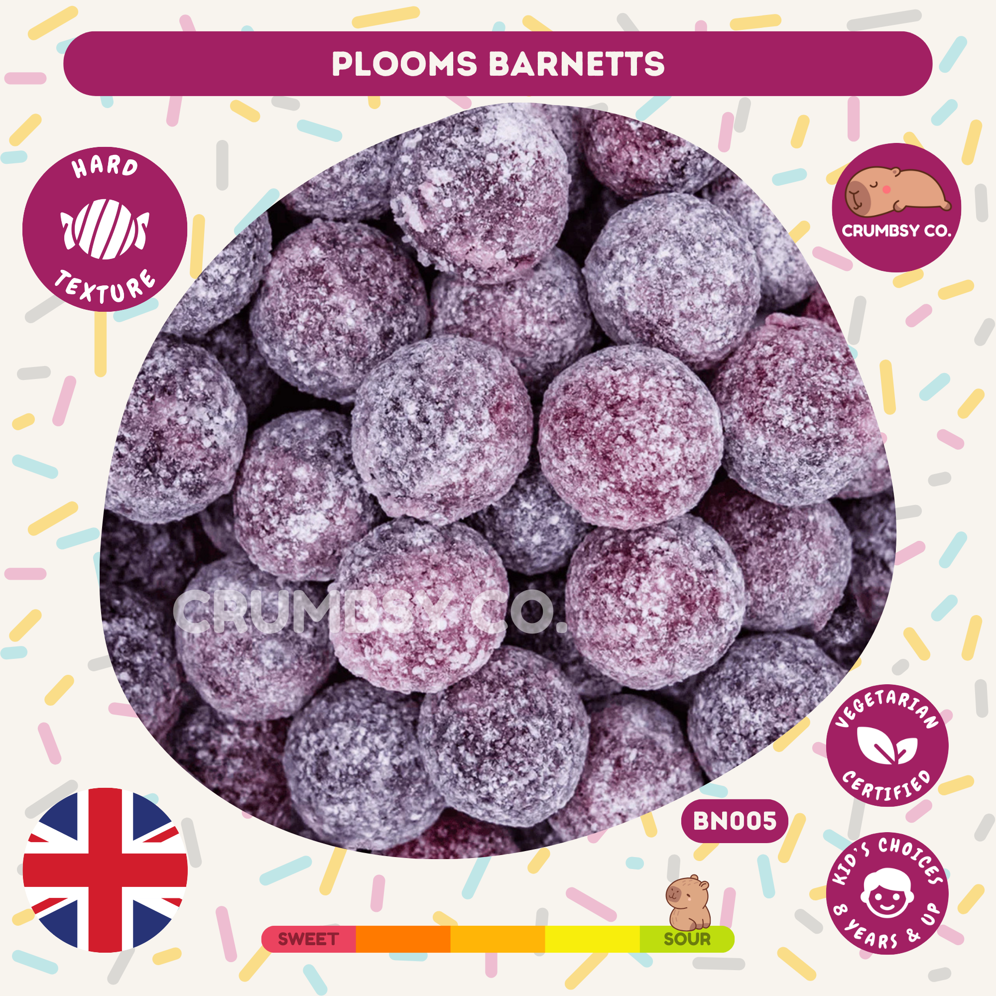 Savour the rich, traditional flavour of Barnett’s Mega Sour Plooms classic British boiled sweets with a deep, fruity plum taste and a hint of tang. Handmade in traditional copper pans, these timeless treats deliver a smooth, full-bodied sweetness that has been enjoyed for generations.
