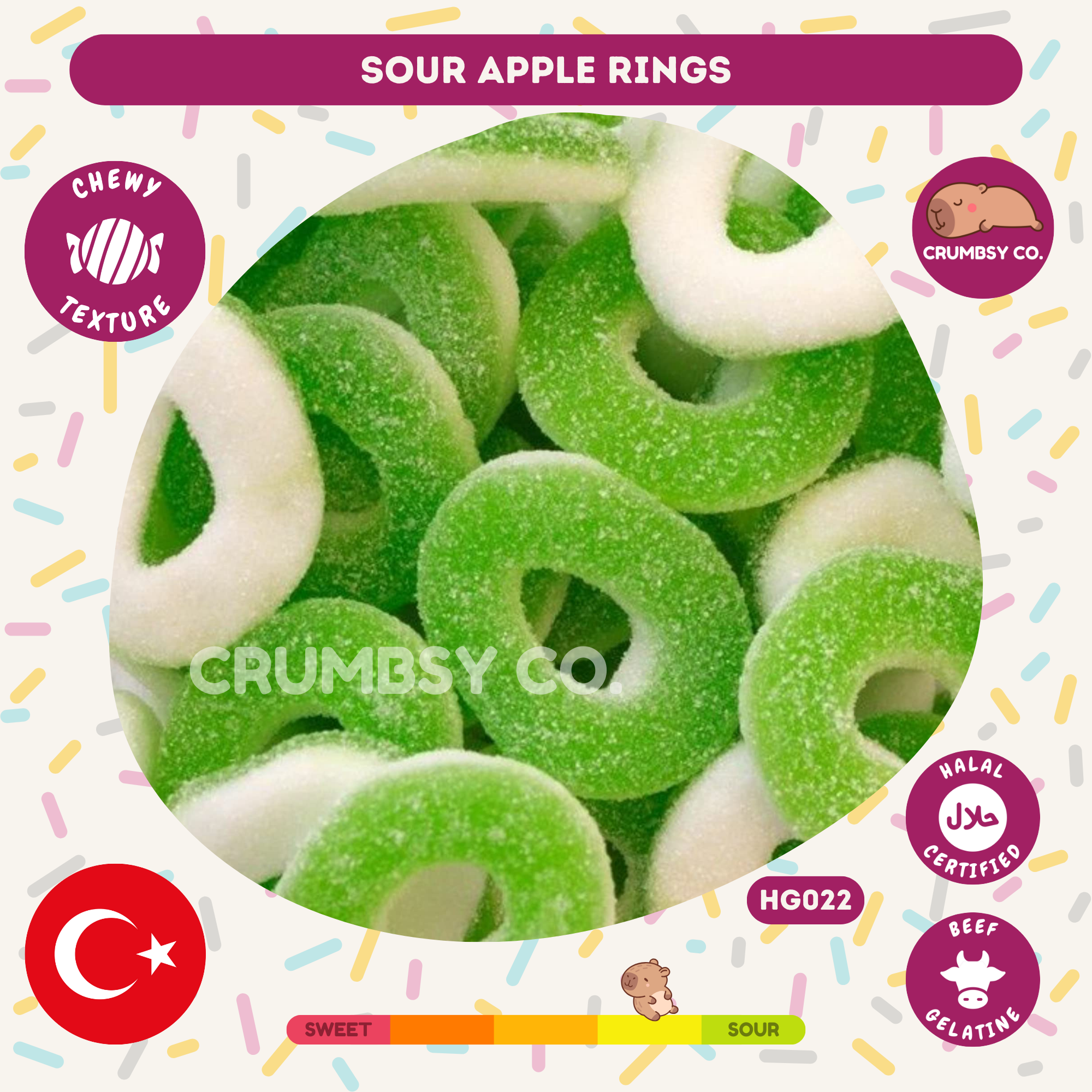 Enjoy the sweet and tangy taste of Sour Apple Rings apple-flavoured jelly sweets coated in a layer of sour sugar for that extra zing. Soft, chewy, and bursting with fruity apple flavour, these vibrant rings are perfect for adding a pop of colour and taste to your halal pick n mix selection.