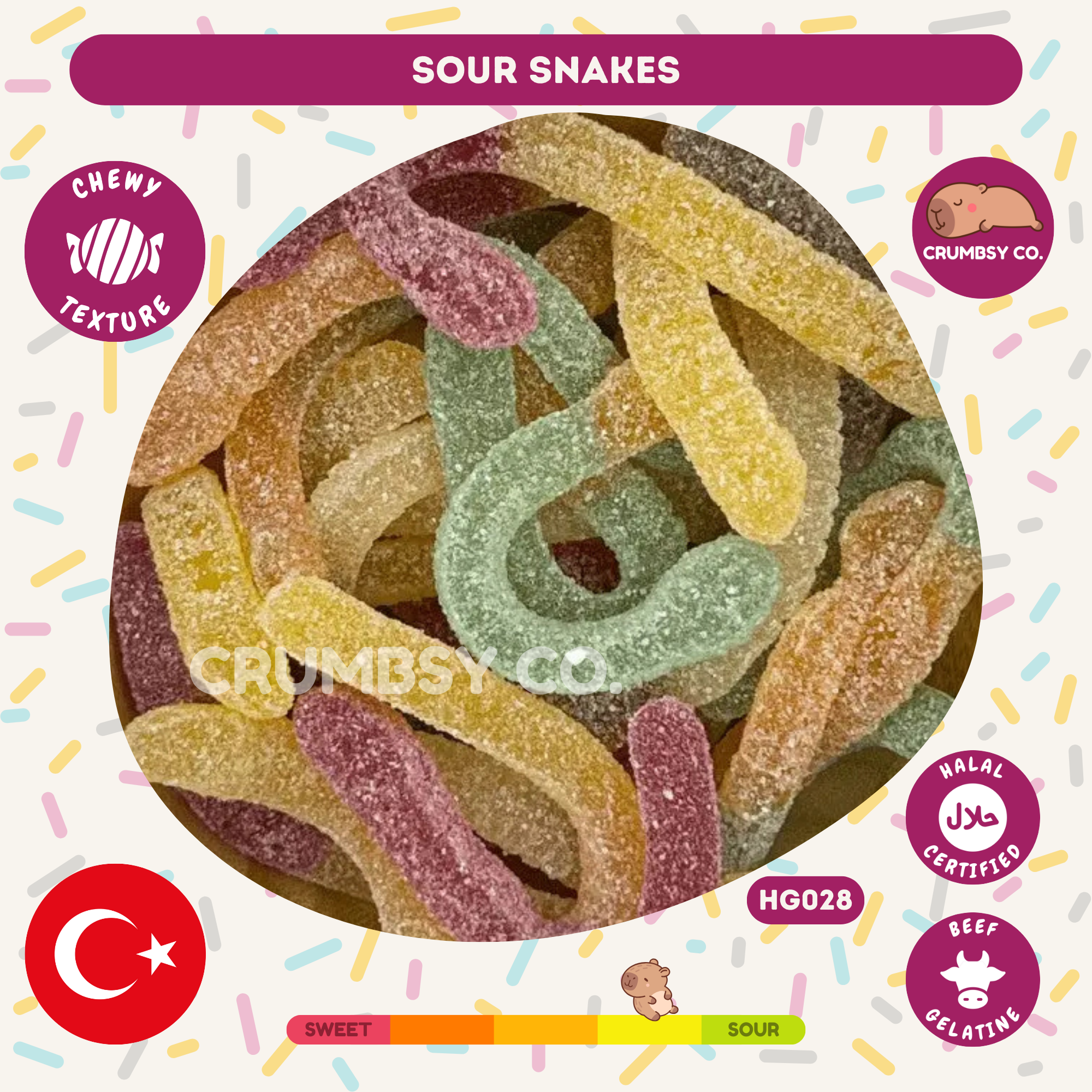 Enjoy the fruity burst of Sour Snakes soft, chewy sweets coated in tangy sour sugar for an extra zing. Each piece offers a playful mix of flavours, perfect for any sour candy lover.